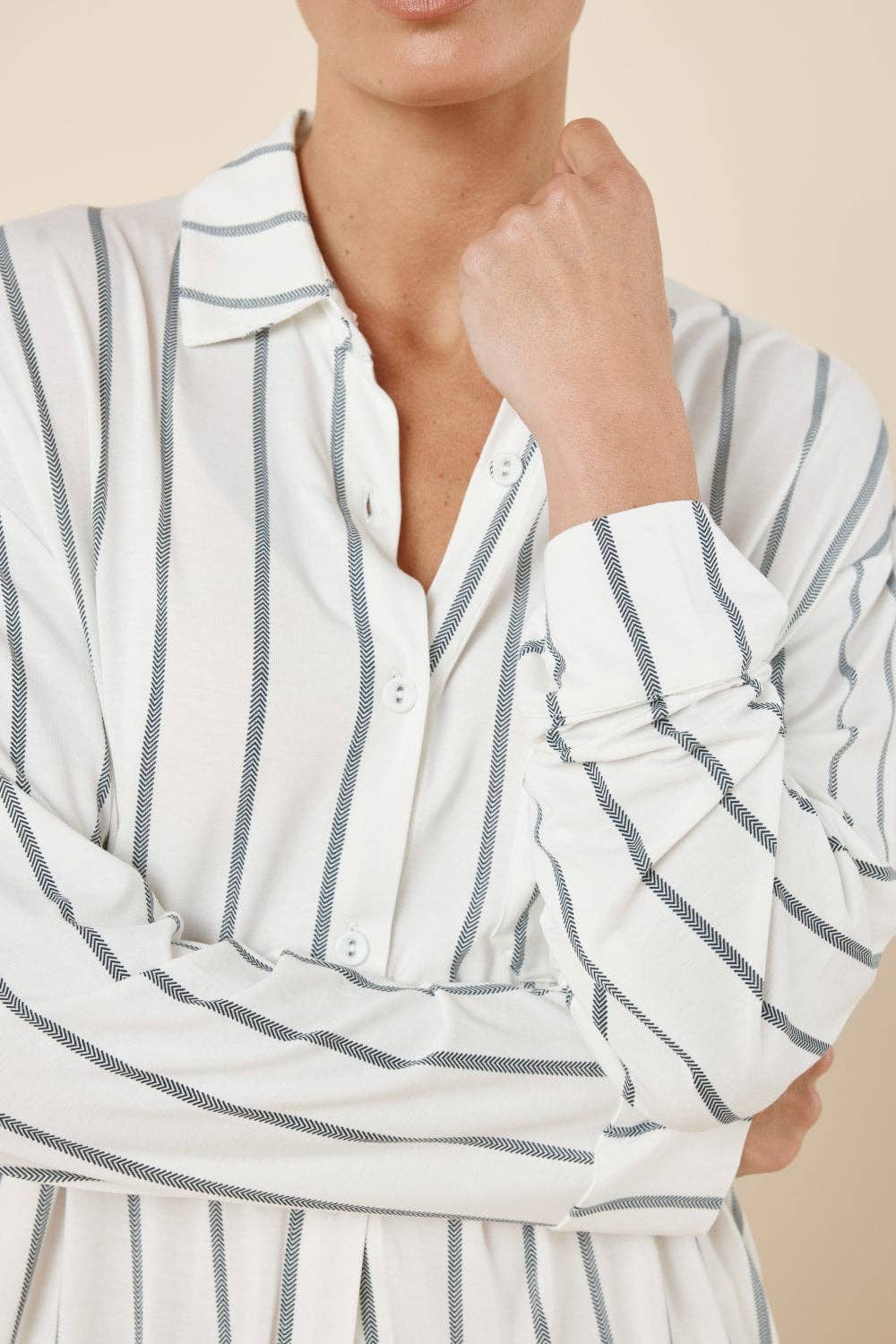 Crafted from buttery soft bamboo, the ivory Harlow PJs have a gentle stretch, designed to regulate temperature and feel exceptionally kind on the skin for all year comfort, day and night.